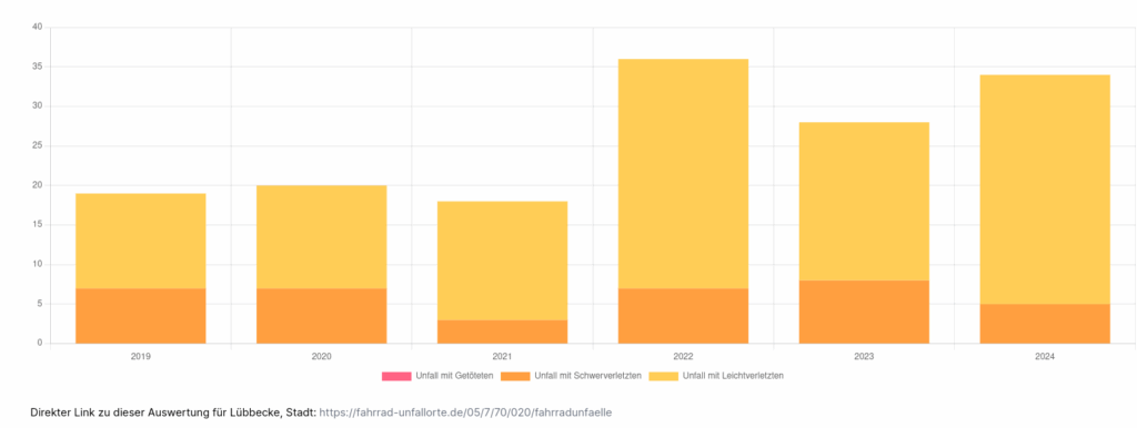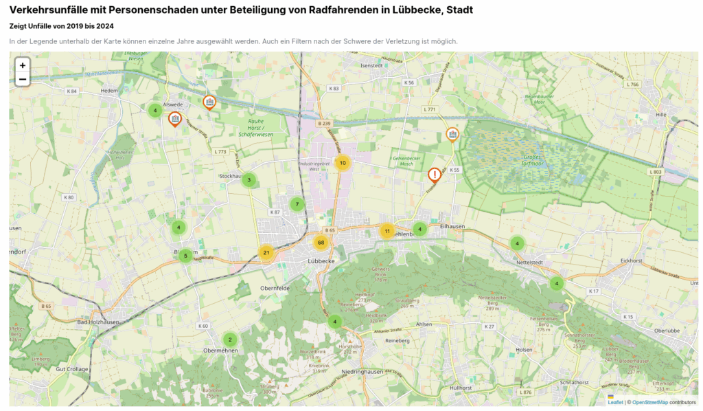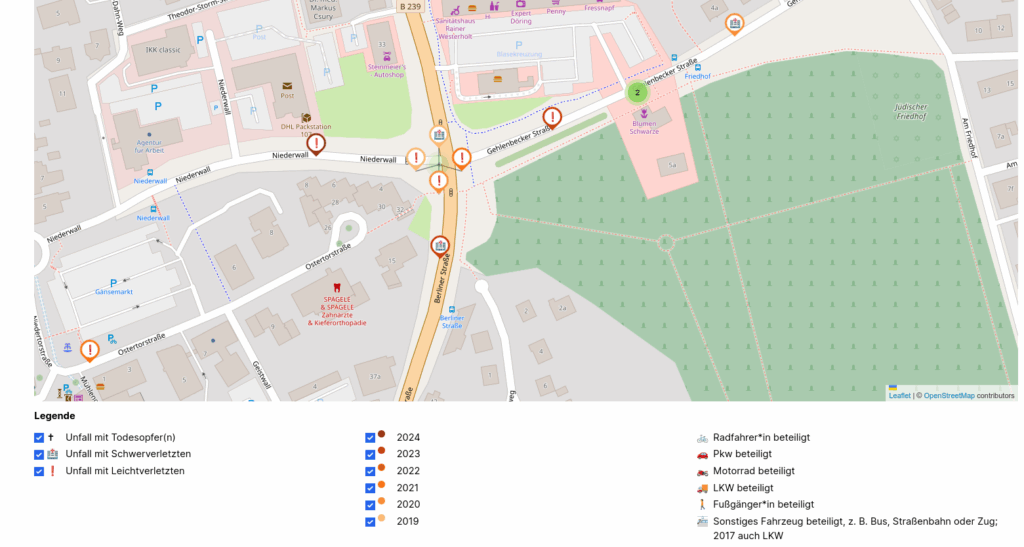 2022 bis 2024 gibt es einen deutlichen Anstieg der Unfallzahlen verglichen mit 2019-2021. Einer der Unfallschwerpunkte der letzten Jahre ist die Blase Kreuzung zusammen mit dem Niederwall und Gehlenbecker Straße.